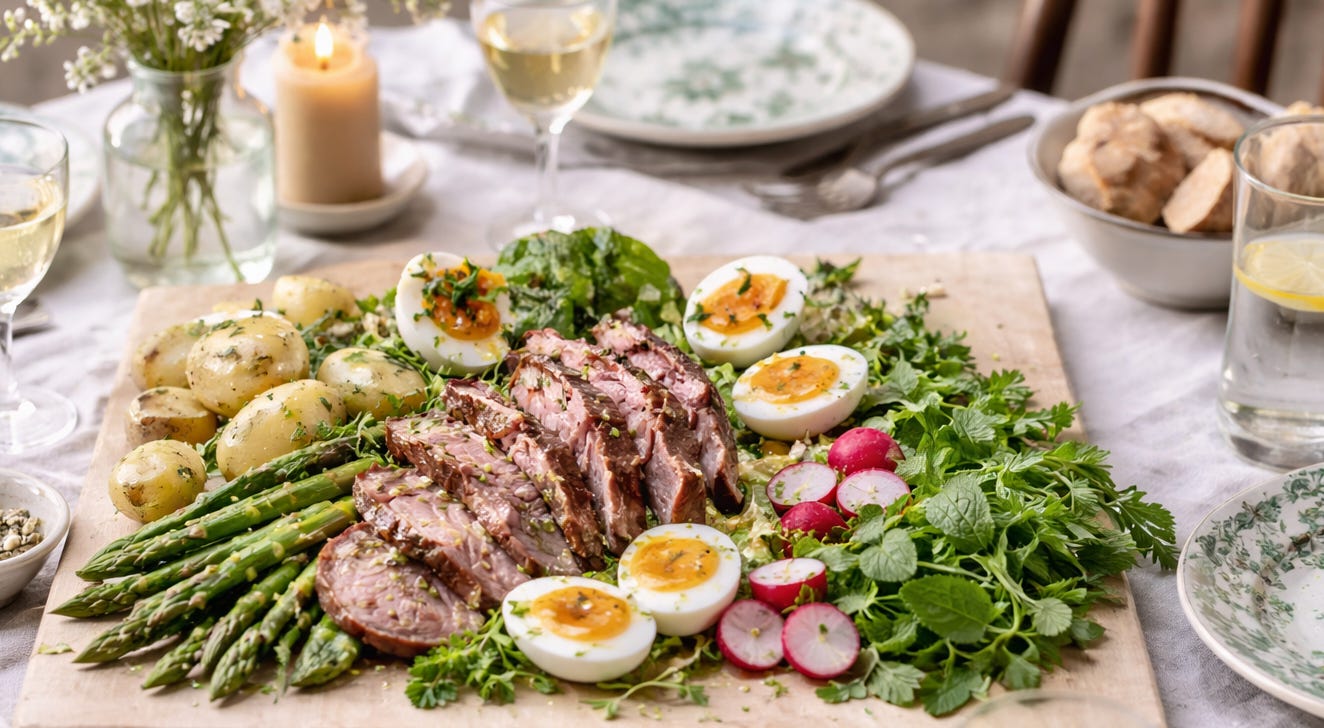I had come across the idea of a spring salmagundi: a long wooden board layered with lamb, the first vegetables of the season, boiled eggs, herbs, dressing pooling between everything. It felt slightly theatrical. Almost old-fashioned. Abundant in a way winter meals rarely are.